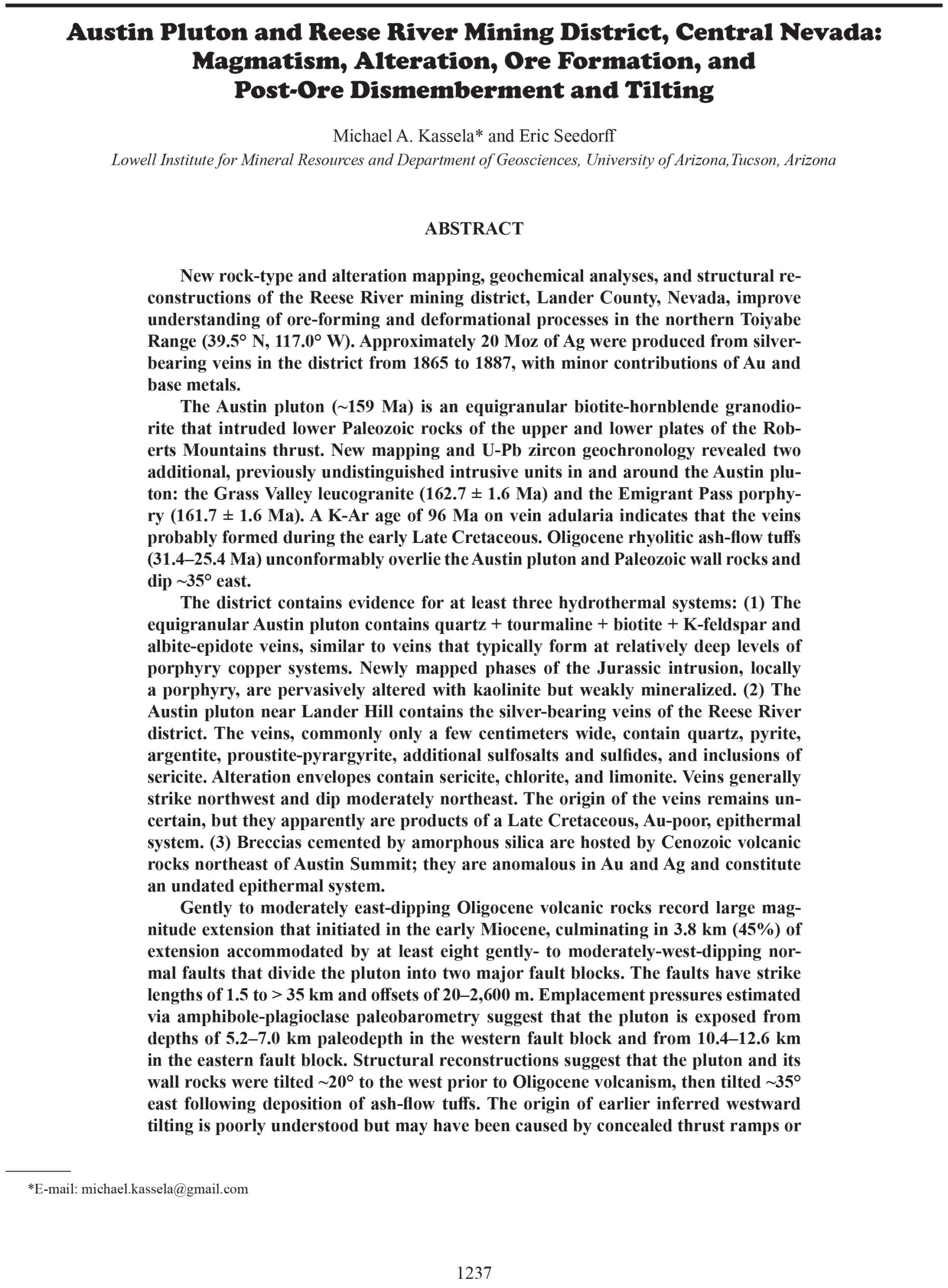 additional, previously undistinguished intrusive units in and around the Austin pluton: the Grass Valley leucogranite (162.7 ± 1.6 Ma) and the Emigrant Pass porphyry (161.7 ± 1.6 Ma). A K-Ar age of 96 Ma on vein adularia indicates that the veins